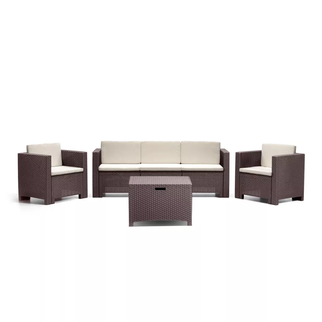 Az Olaszországban gyártott 5 személyes kerti bútor garnitúra rattan stílusra emlékeztető megjelenést kölcsönöz. Két fotellel, egy három személyes kanapéval és egy asztallal levesz mindenkit a lábáról igényes megjelenésével és kényelmével. Könnyen tisztítható és mozgatható, de mégis nagyon stabil kerti bútor. A szett ellenálló a sérülésekkel, az időjárási viszontagságokkal és az UV sugárzással szemben is.