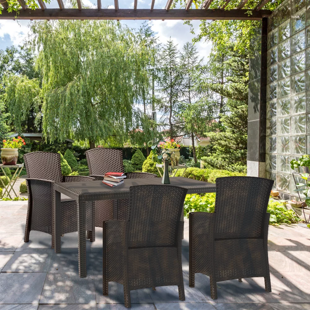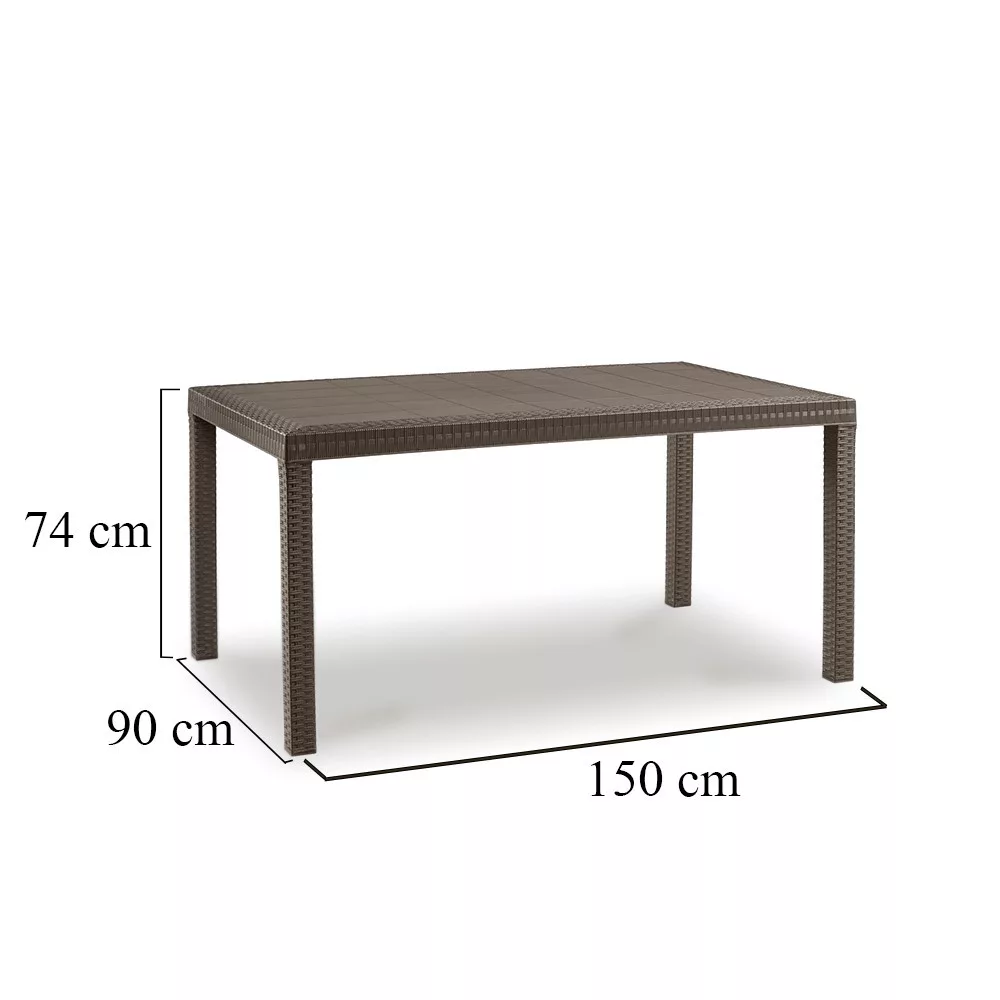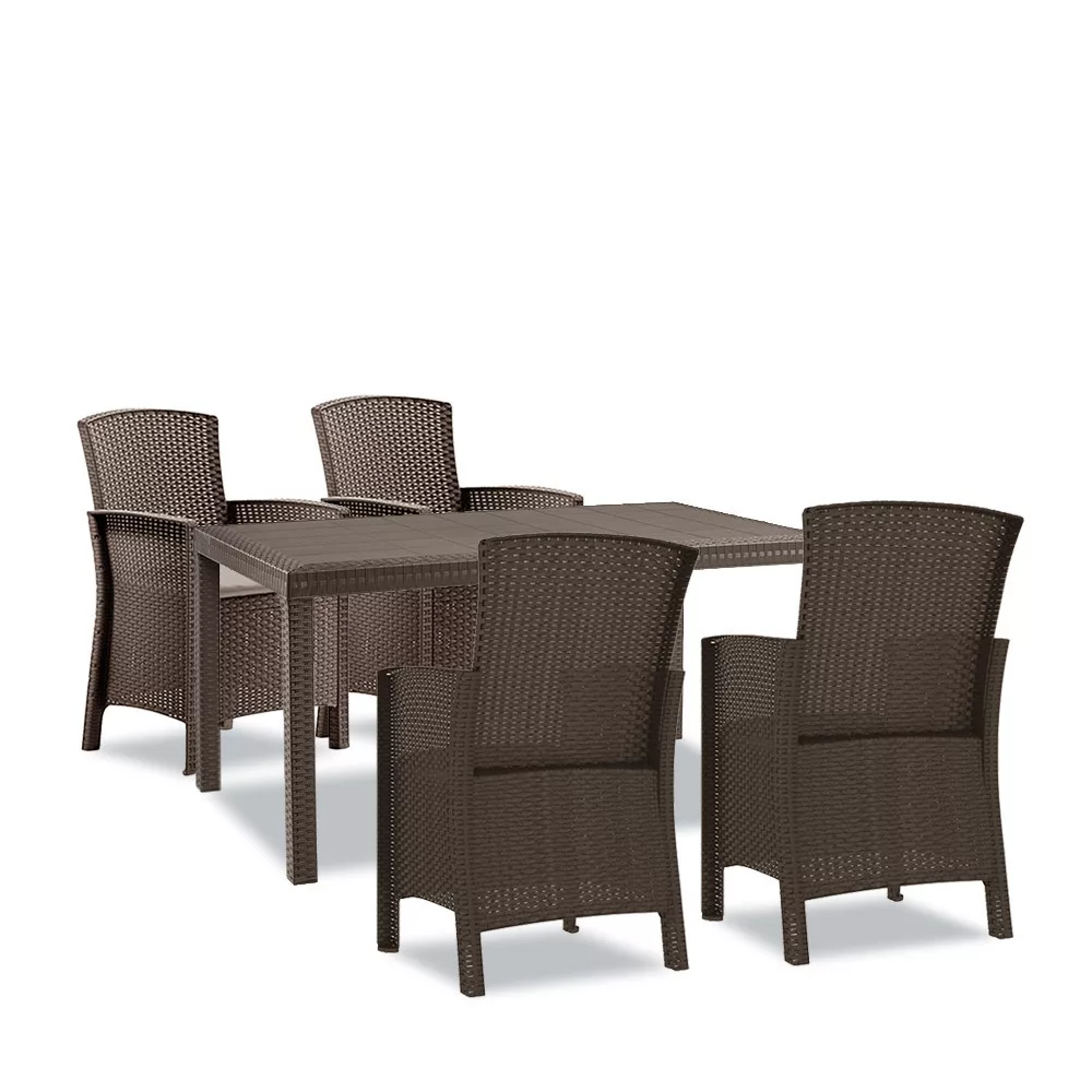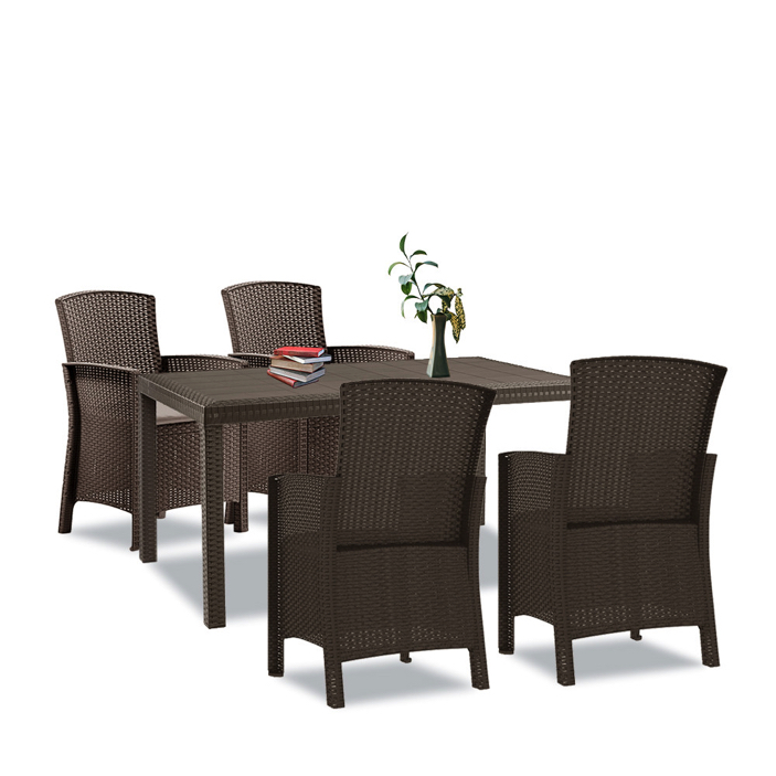 A bútorok időjárásálló fröccsöntött műanyagból készülnek, ami tartósságot és hosszú élettartamot biztosít. A barna színű rattan hatású felület pedig elegáns és modern megjelenést kölcsönöz a bútoroknak, mellyel bármiylen stílusú térhez illeszthető.