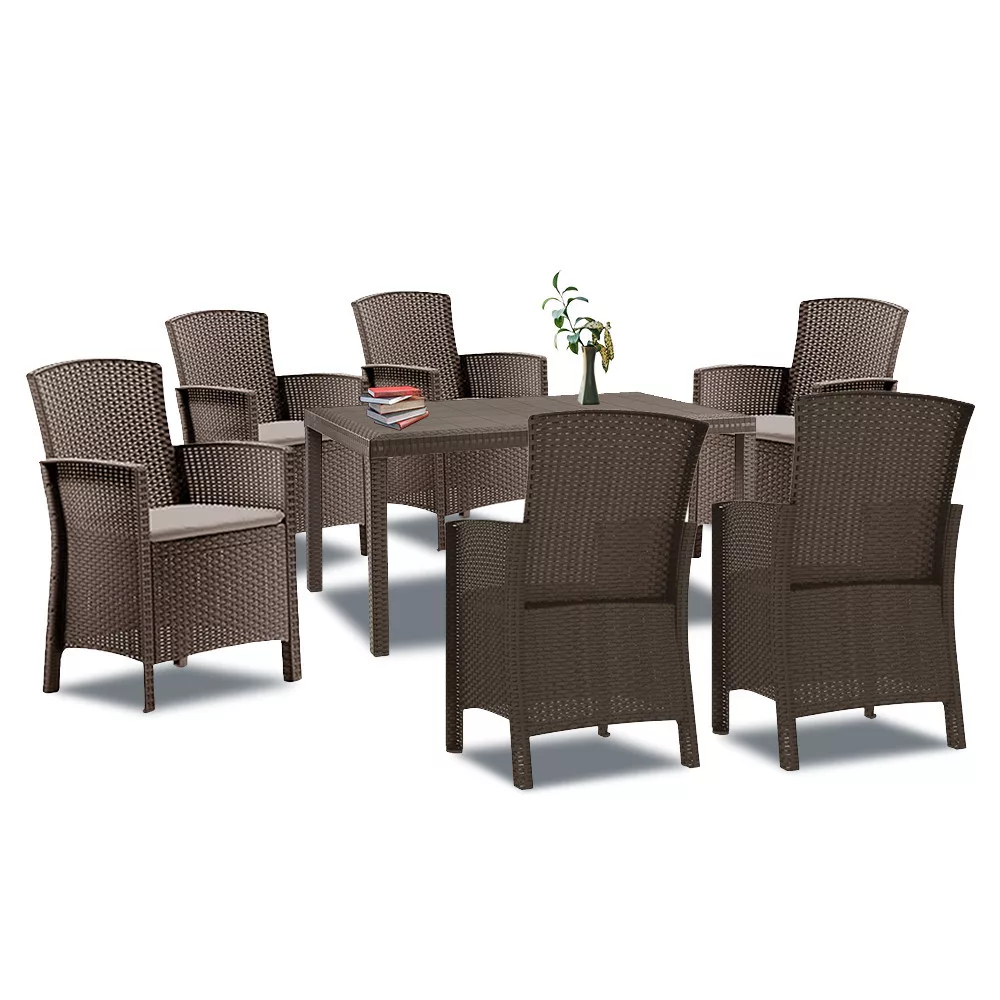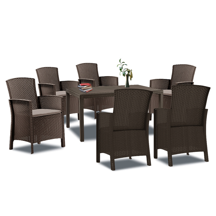 A bútorok időjárásálló fröccsöntött műanyagból készülnek, ami tartósságot és hosszú élettartamot biztosít. A barna színű rattan hatású felület pedig elegáns és modern megjelenést kölcsönöz a bútoroknak, mellyel bármiylen stílusú térhez illeszthető.