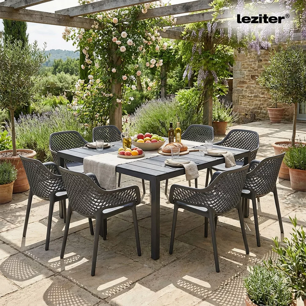 A rakásolható Letino székek kényelmes ülőpozíciót nyújtanak, és használaton kívül egyszerűen tárolhatók. Az időjárásálló anyagok ellenállnak a napsütésnek, esőnek és a mindennapi igénybevételnek, így a szett egész szezonban gondtalanul használható.