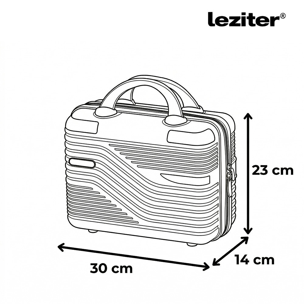 Tartalom és méretek: Neszeszer: 23 × 30 × 14 cm | 11 liter | 0,77 kg Kabinbőrönd: 55 × 40 × 20 cm | 38 liter | 2,6 kg Közepes bőrönd: 68 × 45 × 25 cm | 60 liter | 2,65 kg Nagy bőrönd: 76 × 50 × 29 cm | 100 liter | 3,3 kg