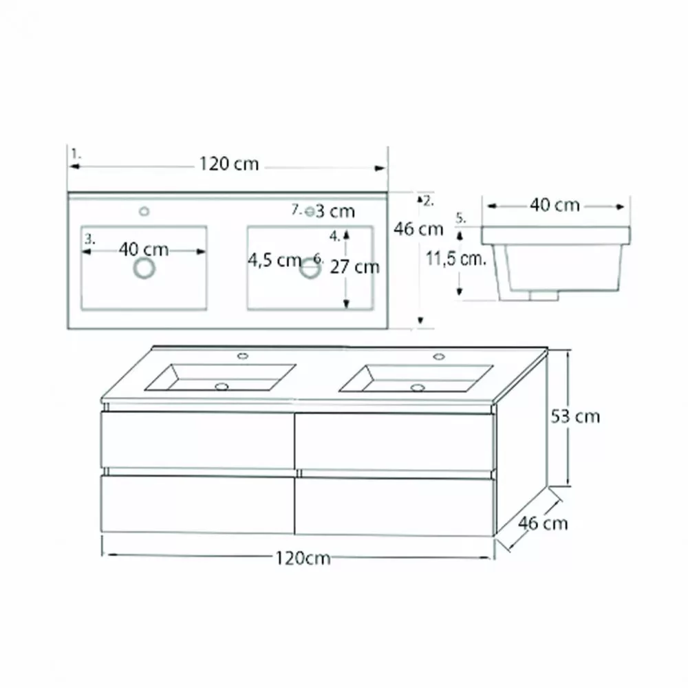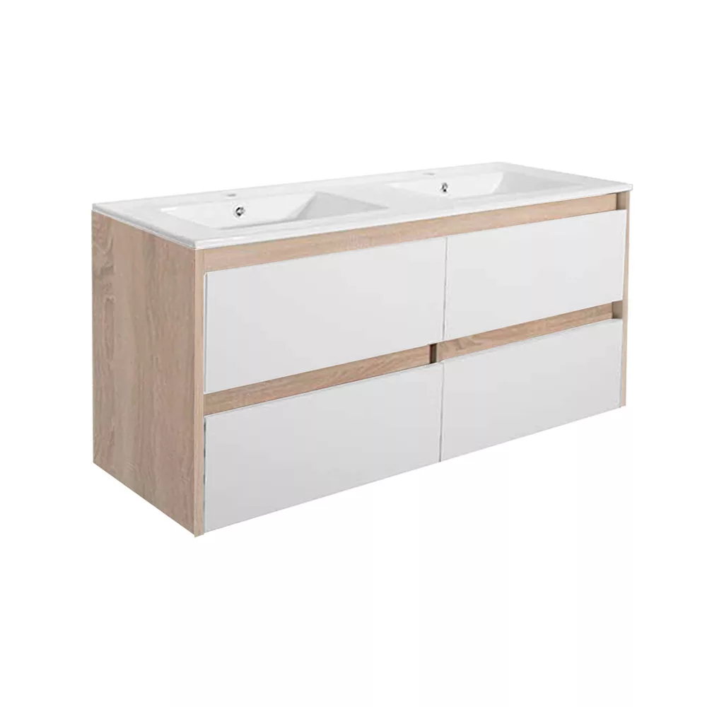 A csomag része a bútorra tökéletesen illeszkedő, fehér színű, dupla medencés kerámia mosdó is, amely két csaptelep számára kialakított hellyel rendelkezik. így nem kell külön keresni a hozzáillő mosdót. A csomag nem tartalmazza a csaptelepeket és a leeresztőt!
