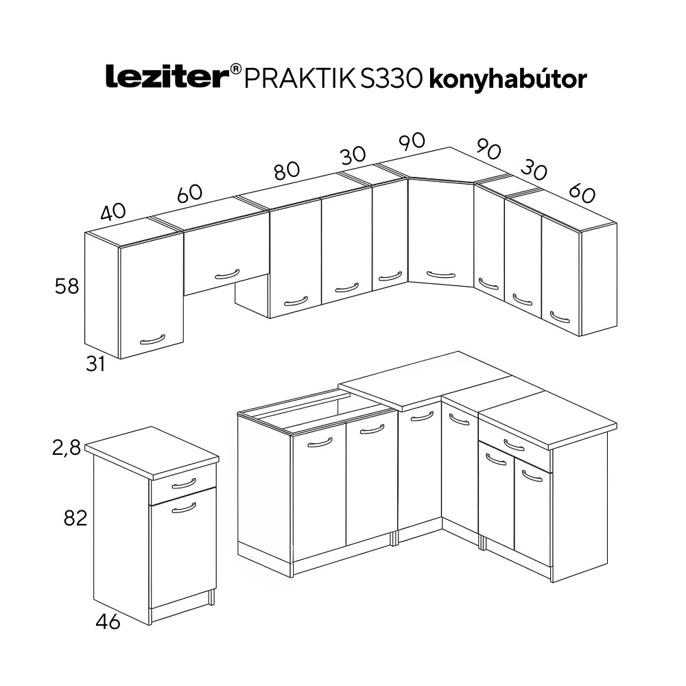 A Praktik sarok konyhabútor fehér korpusszal és fehér fronttal időtálló, letisztult megjelenést kínál, amely könnyedén illeszkedik bármilyen lakberendezési stílushoz. Világos színvilága optikailag tágítja a teret, így ideális választás különböző méretű konyhákba.