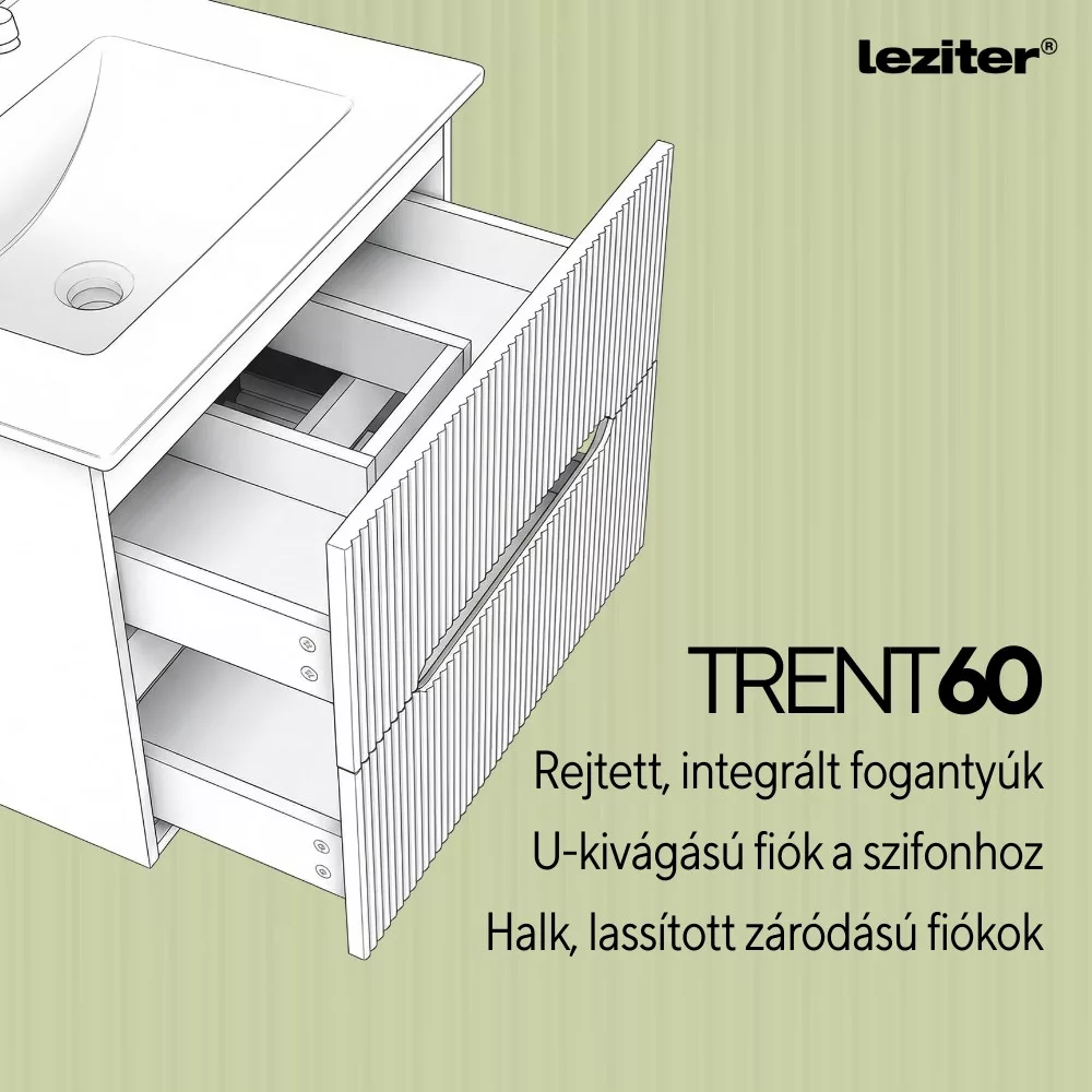 A Leziter Trent fürdőszobabútor harmonikusan ötvözi a látványt és a praktikumot. A bordázott előlap letisztult, modern karaktert ad, miközben az integrált fogantyú kényelmes használatot tesz lehetővé. A fali rögzítés könnyed megjelenést teremt, a padló takarítása pedig gyorsabbá válik.