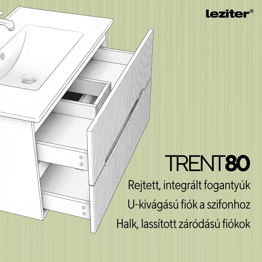 A Leziter Trent fürdőszobabútor harmonikusan ötvözi a látványt és a praktikumot. A bordázott előlap letisztult, modern karaktert ad, miközben az integrált fogantyú kényelmes használatot tesz lehetővé. A fali rögzítés könnyed megjelenést teremt, a padló takarítása pedig gyorsabbá válik.